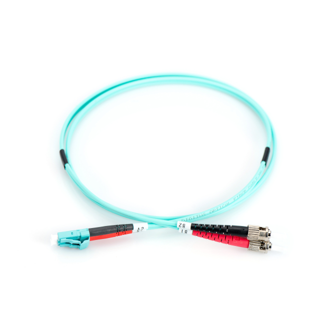 Este cable cuenta con conectores LC en un extremo y ST en el otro, ambos de género macho.