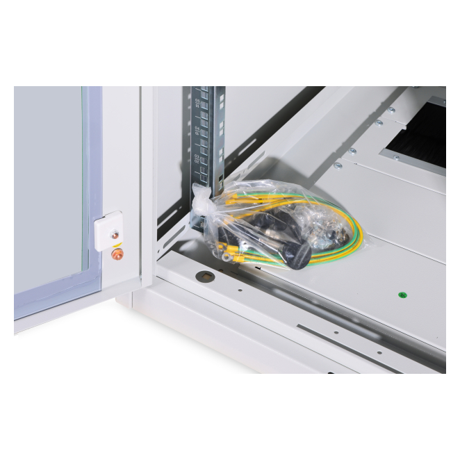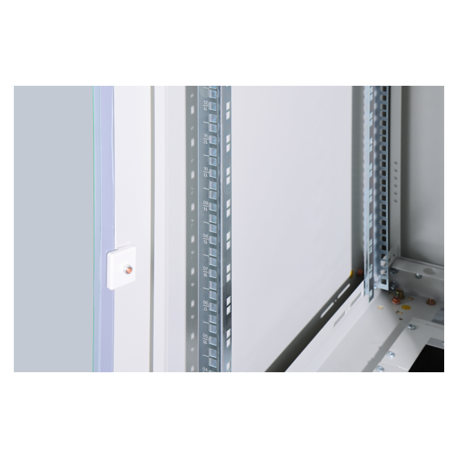 Incluye una cerradura semicilíndrica con llave tipo 333 y paneles desmontables para acceder fácilmente a los equipos mientras los protege. Soporta una capacidad de carga de hasta 1200 kg, ideal para equipos pesados y configuraciones complejas. Diseño modular que permite desmontar completamente el armario, facilitando el transporte y la instalación. Ofrece generosas entradas de cables con cepillos y conductos verticales, asegurando una organización eficiente.