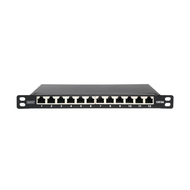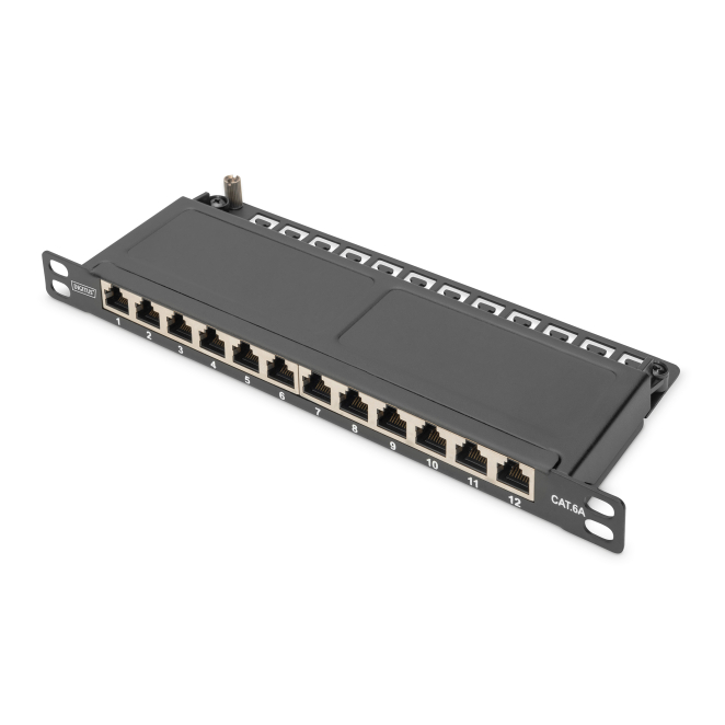 Digitus CAT 6A Slim Patch Panel, blindado, 12 puertos, 0,5 U, 10″, negro