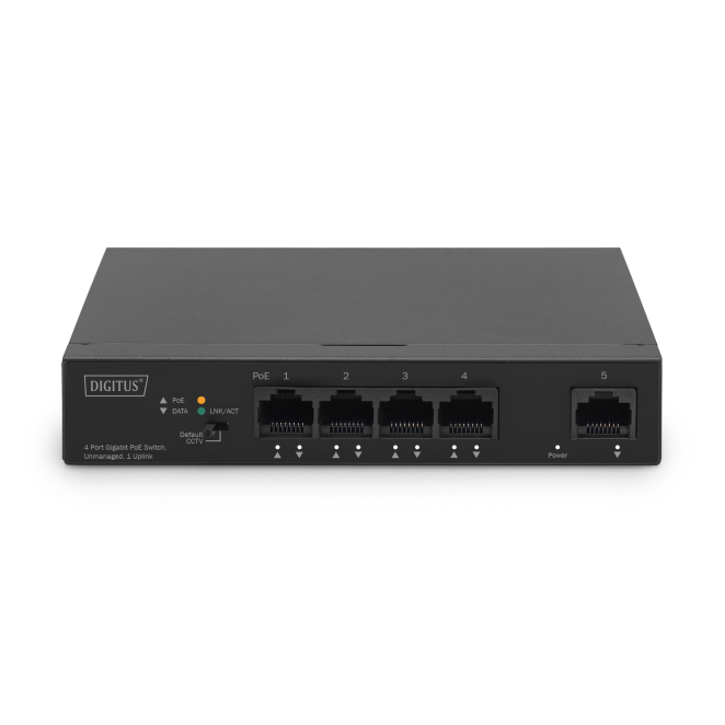 Imagen del producto Digitus Conmutador PoE Gigabit Ethernet, modelo DN-95330-1, con 4 puertos PoE y 1 puerto Uplink, capacidad total de 60 W