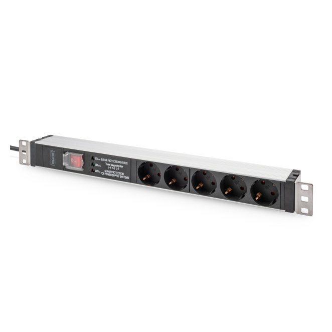 Digitus Regleta de enchufes con perfil de aluminio y conmutador, protección contra sobrecarga, filtro de red integrado, 5 enchufes con contacto de pue