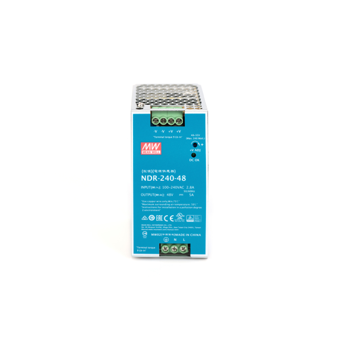 El adaptador ofrece una potencia total de 240 W, proporcionando una fuente de alimentación estable y eficiente para tus equipos industriales.
