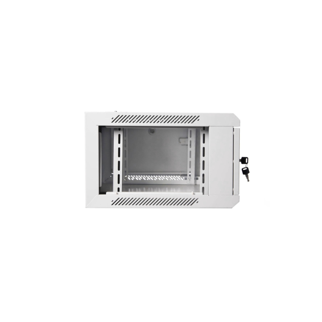 Imagen del armario rack de pared gris claro Digitus DN-W19 04U/450/MD, con capacidad de 4U y puerta metálica. SKU: DN-W19 04U/450/MD.
