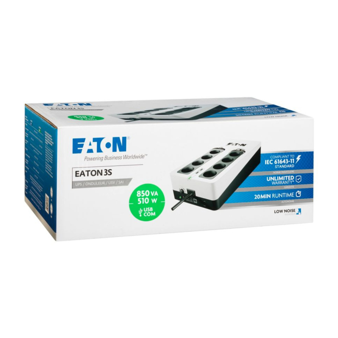 Eaton 3S850D sistema de alimentación ininterrumpida UPS en espera, 0,85 kVA y 510 W con 8 salidas AC, SKU 3S850D