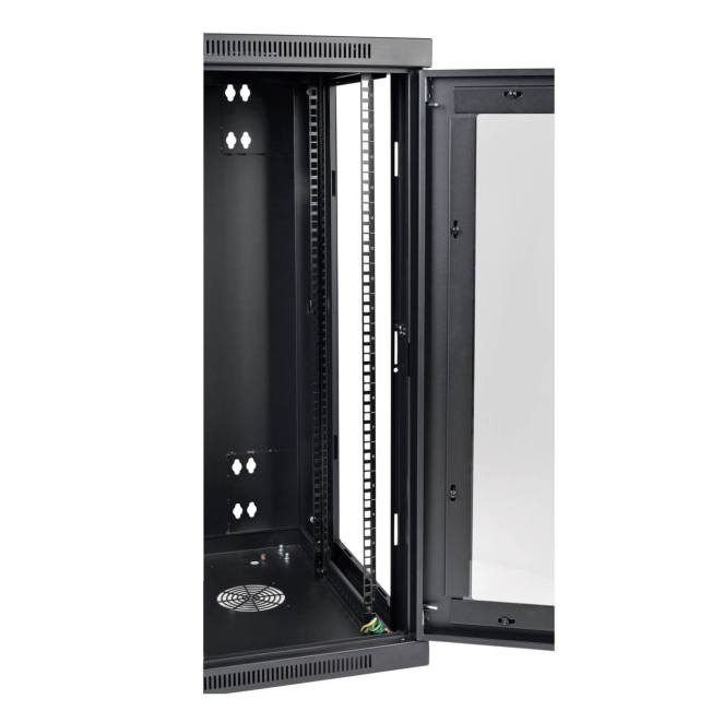 Permite instalar equipos en la pared, liberando espacio en el suelo. La ventana de acrílico permite visualizar el estado de los equipos sin abrir el gabinete. El diseño con bisagras permite un fácil acceso a los equipos para instalación y mantenimiento. Los paneles y puertas con cerradura permiten mantener seguros los equipos valiosos. Ideal para diversas aplicaciones, desde centros de datos hasta aulas y tiendas minoristas.