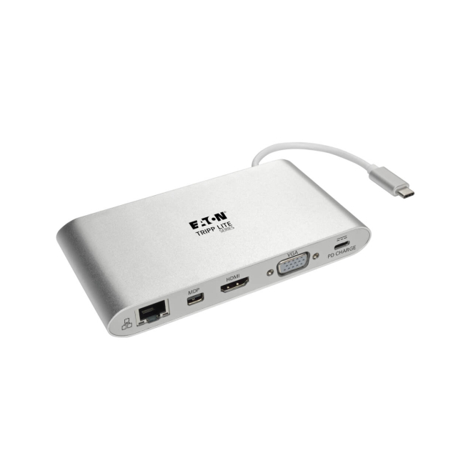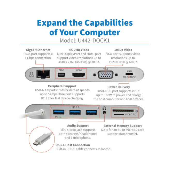 Tripp Lite U442-DOCK1 estación de conexión USB-C, doble pantalla – 4K HDMI/mDP, VGA, USB 3.2 Gen 1, hub USB A y USB C, GbE, tarjeta de memoria, carga PD de 60W