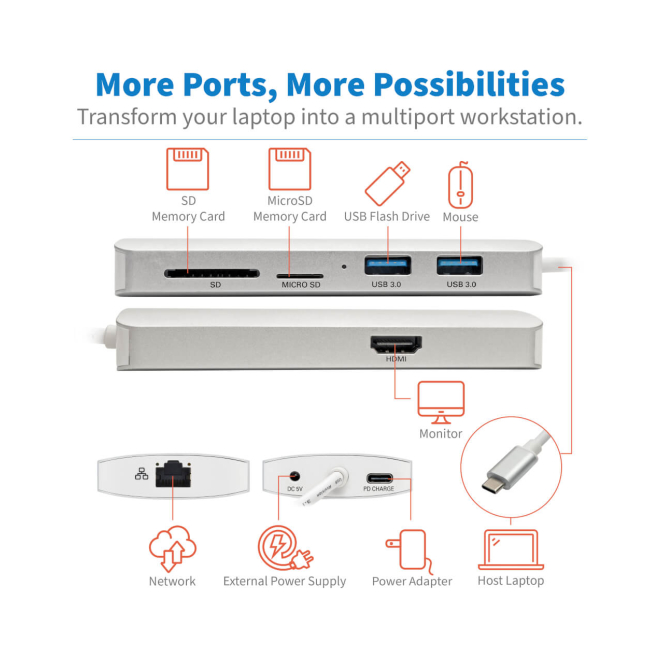 Tripp Lite Estación de Conexión USB-C Type-C, 4K @ 30 Hz, HDMI, Thunderbolt 3, USB-A Hub, Carga PD, SD / Micro SD, GbE – Plata