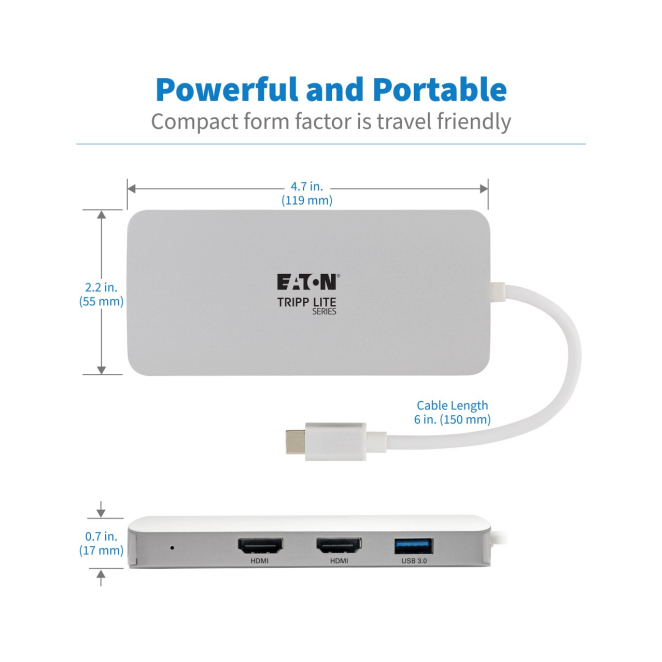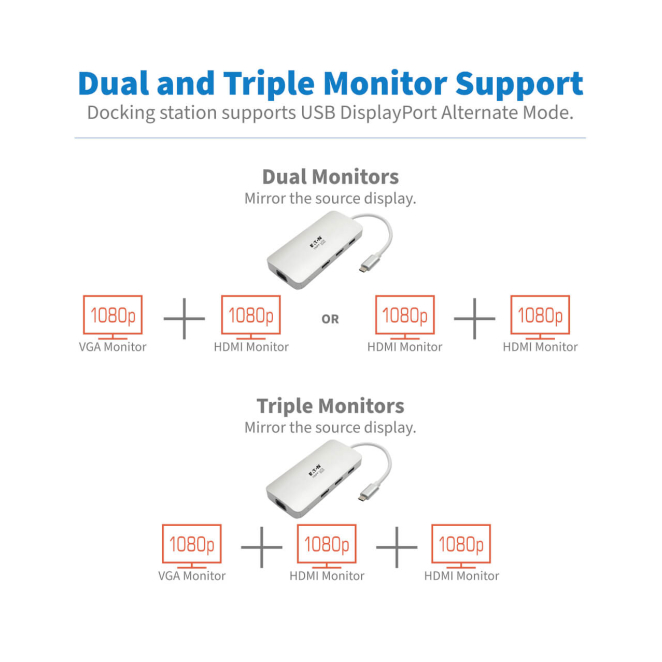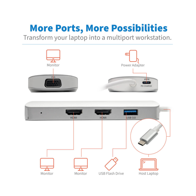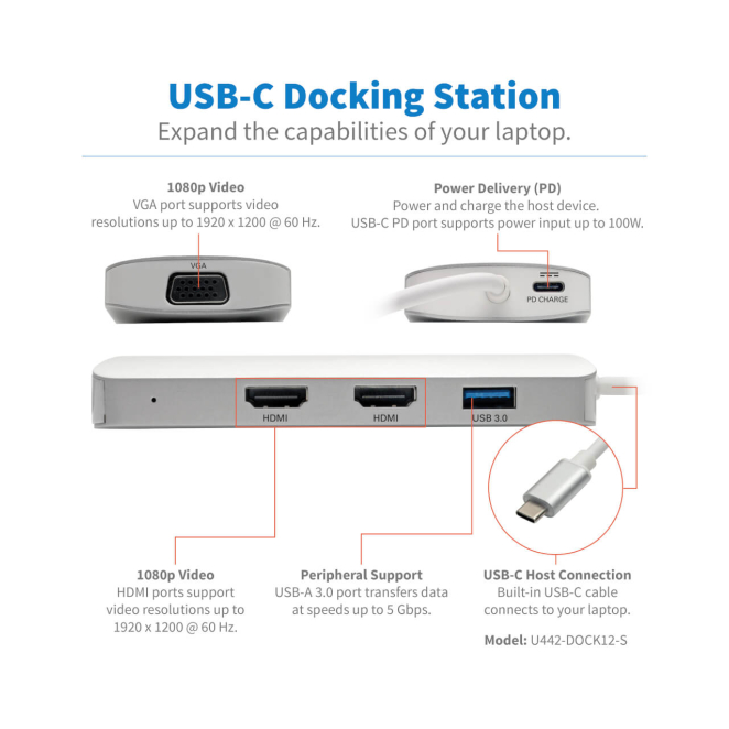 Tripp Lite Estación de Conexión USB-C, (x2) HDMI + VGA, Thunderbolt 3, USB-A, Carga PD – 1080p @ 60 Hz, Plata