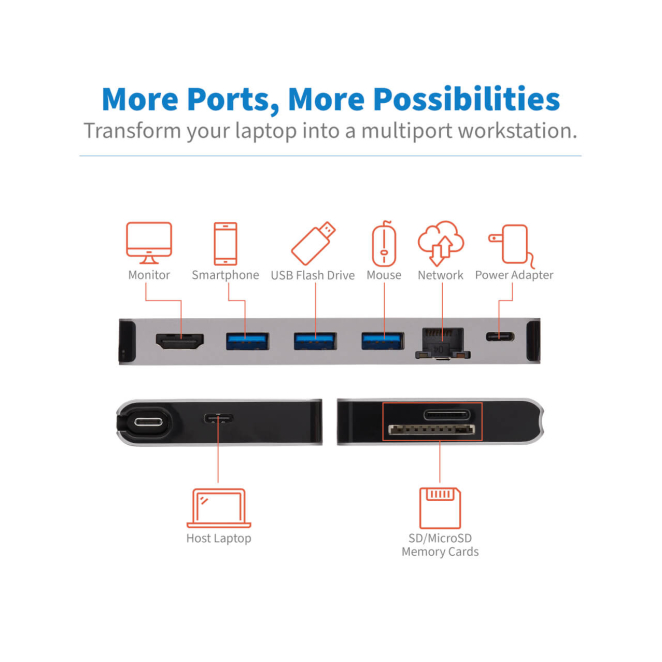 Permite la conexión de múltiples dispositivos gracias a sus múltiples puertos, incluyendo HDMI 4K, USB 3.2 Gen 1, y lector de tarjetas de memoria.