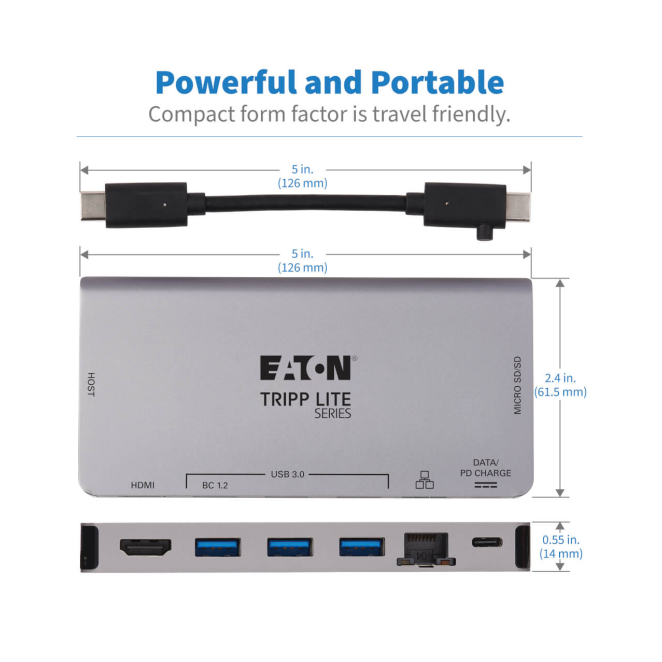 Tripp Lite U442-DOCK5D-GY Estación de Conexión USB C – 4K HDMI, USB 3.2 Gen 1, Hub USB A, GbE, Tarjeta de Memoria, Carga PD de 100W, Cable Desprendible, Gris