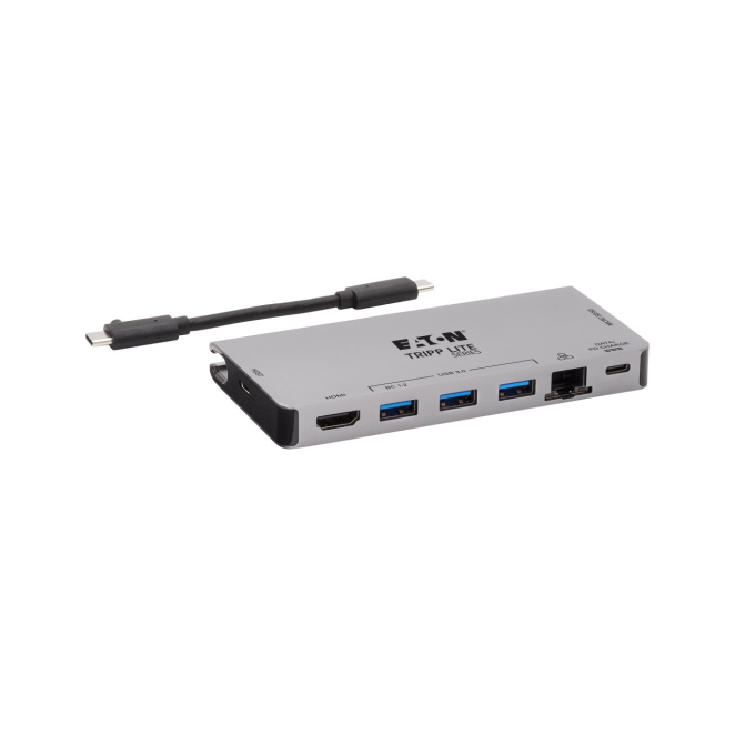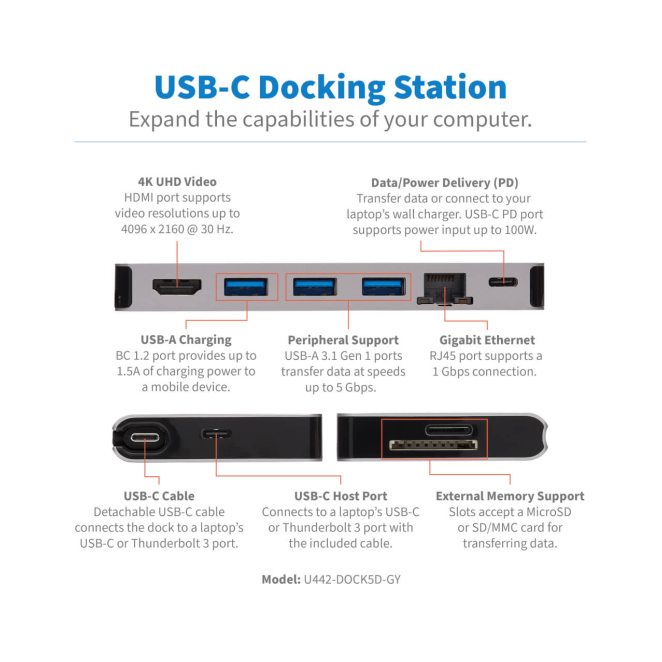 Tripp Lite U442-DOCK5D-GY Estación de Conexión USB C con 4K HDMI, USB 3.2 Gen 1, Hub USB A, GbE, Tarjeta de Memoria y Carga PD de 100W en color gris – SKU U442-DOCK5D-GY