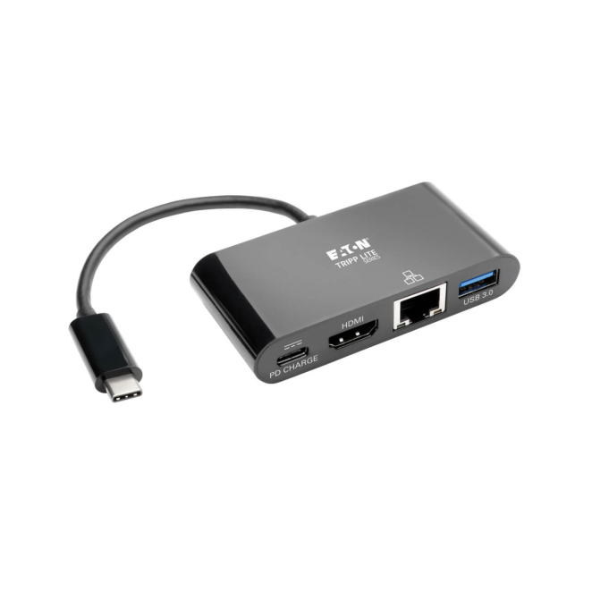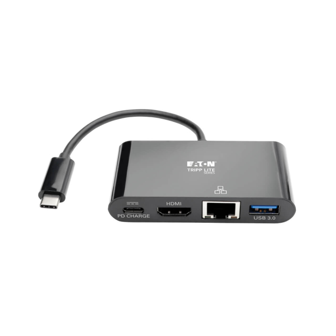 Tripp Lite Adaptador USB-C Type-C a HDMI con Hub USB-A, Gigabit Ethernet, Thunderbolt 3, 4K — Carga PD, 30 Hz, Negro