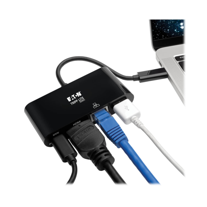 Tripp Lite Adaptador USB-C Type-C a HDMI con Hub USB-A, Gigabit Ethernet, Thunderbolt 3, 4K, Carga PD, 30Hz, SKU U444-06N-H4GUBC, color negro