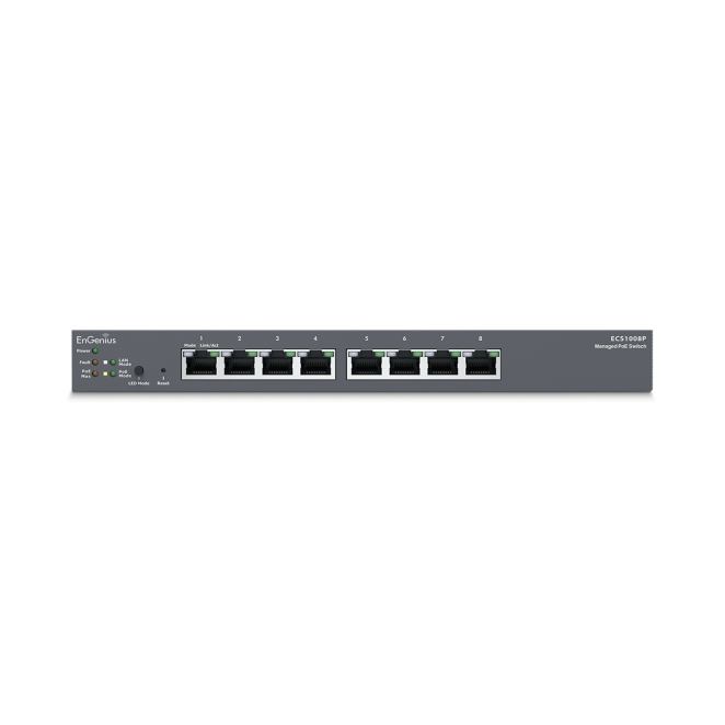 EnGenius ECS1008P switch gestionado L2 con 8 puertos Gigabit Ethernet (10/100/1000) y soporte de energía sobre Ethernet (PoE). SKU: ECS1008P