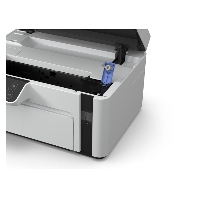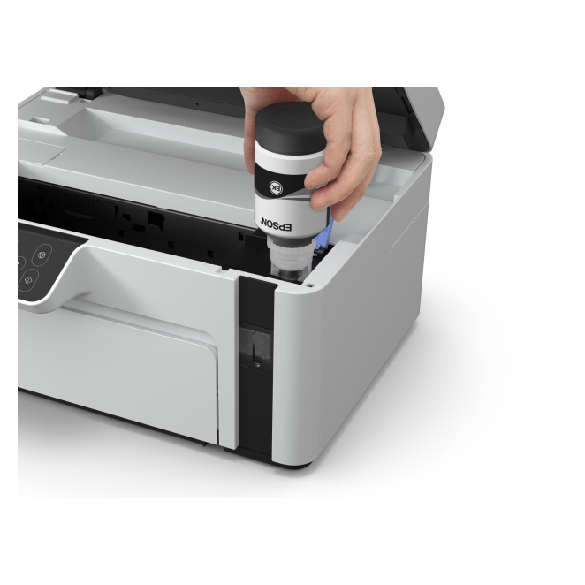 Aquí respondemos algunas de las preguntas más comunes sobre la Epson EcoTank M2120: No, esta impresora está diseñada para imprimir únicamente en blanco y negro. Sí, con una velocidad de hasta 32 ppm y un ciclo de trabajo máximo de 15,000 páginas, es ideal para tareas grandes. Sí, la Epson EcoTank M2120 cuenta con conectividad WiFi para facilitar la impresión desde cualquier dispositivo compatible. El Epson EcoTank M2120 tiene un consumo energético de 4.3 W en modo preparado, 0.2 W apagada y 0.7 W en modo suspensión. Sí, la recarga es sencilla gracias al diseño EcoTank de Epson, el cual permite una recarga sin complicaciones y sin derrames. Formatos de imagen soportados BMP, JPEG, PICT, PNG, TIFF Tecnología de impresión Inyección de tinta Impresión Impresión en blanco y negro Impresión dúplex No Resolución máxima 1440 x 720 DPI Velocidad de impresión (negro, calidad normal, A4/US Carta) 32 ppm Tiempo hasta primera página (negro, normal) 8 s Copia a doble cara No Resolución óptica de escáner 1200 x 2400 DPI Escaneado dúplex No Escaneando Escaneado monocromo Tecnología de escaneado CIS Enviando por fax No Posicionamiento de mercado Hogar y oficina Funciones dúplex No compatible Colores de impresión Negro Formatos de imagen soportados BMP, JPEG, PICT, PNG, TIFF Tipo de escaneado Escáner de cama plana Color del producto Blanco Pantalla incorporada Sí Pantalla a color Sí Ciclo de trabajo (máximo) 15000 páginas por mes Número total de bandejas de entrada 1 Capacidad de salida total 30 hojas Tipos de papel Papel normal, Sobres ISO tamaño de serie A (A0...A9) A4, A5, A6 ISO tamaño de serie B (B0...B9) B5, B6 Tamaño de impresora No-ISO Carta, Legal Tamaño de sobres 10, C6, DL Peso del papel 64-90 g/m² Impresión directa Sí Puerto USB Sí Tecnología de impresión móvil Apple AirPrint, Epson Connect, Epson Email Print, Epson iPrint, Epson Remote Print Wifi Sí Ethernet No Algoritmos de seguridad soportados 128-bit WEP, 64-bit WEP, WPA-AES, WPA-PSK, WPA-TKIP Consumo energético (en suspensión) 0.7 W Consumo de energía (apagado) 0.2 W Voltaje de entrada AC 100 - 240 V Sistema operativo Windows soportado Windows 10, Windows 7, Windows 8, Windows 8.1, Windows Vista Sistema operativo MAC soportado Mac OS X 10.7 Lion, Mac OS X 10.8 Mountain Lion, Mac OS X 10.9 Mavericks, Mac OS X 11.0 Big Sur Ancho 375 mm Profundidad 318 mm Altura 200 mm Peso 5000 g