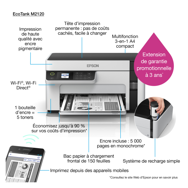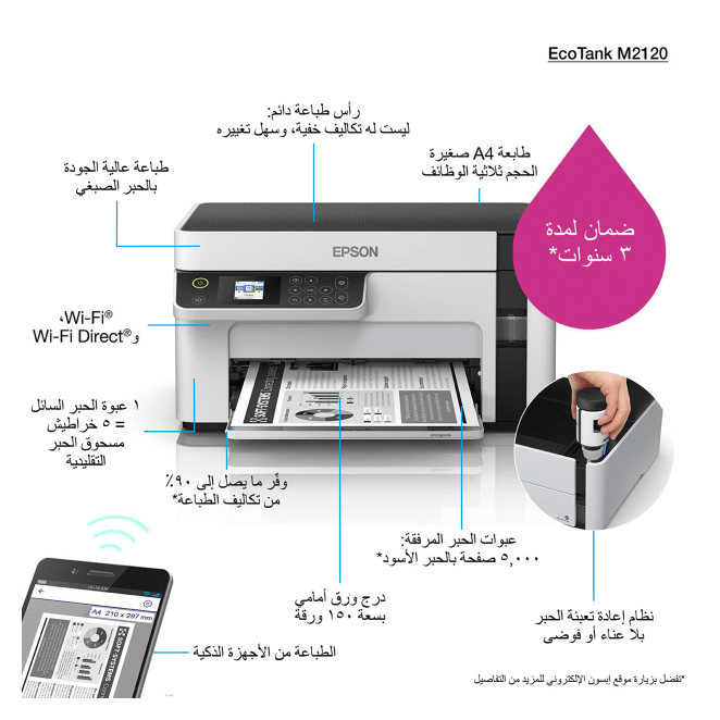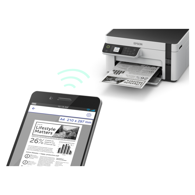 La Epson EcoTank M2120 es una opción excelente por muchas razones. Aquí te presentamos algunas de las más importantes: La resolución de 1440 x 720 DPI garantiza excelentes resultados de impresión. Imprime hasta 32 páginas por minuto, ideal para tareas grandes y apremiantes. Imprime desde cualquier dispositivo sin necesidad de cables. Bajo consumo de energía tanto en reposo como apagada. Interfaz intuitiva y fácil configuración, perfecta para cualquier usuario.