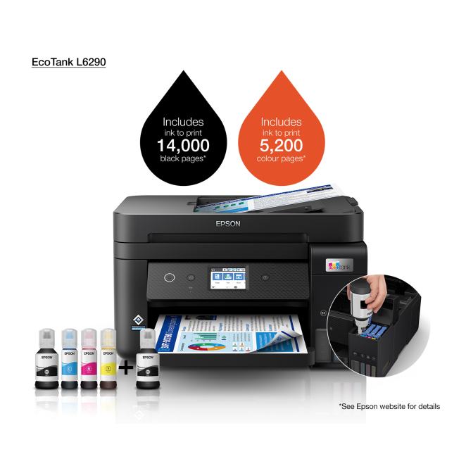 La impresora Epson EcoTank L6290 es perfecta para hogares y oficinas que requieren una solución versátil para sus necesidades documentales. Adecuada tanto para profesionales que requieren documentos de alta precisión como para estudiantes y familias que buscan impresoras multifunción que puedan manejar tareas desde proyectos escolares hasta impresiones de fotografías. Es también ideal para pequeñas empresas gracias a su funcionalidad de escaneo avanzado y envío de fax.