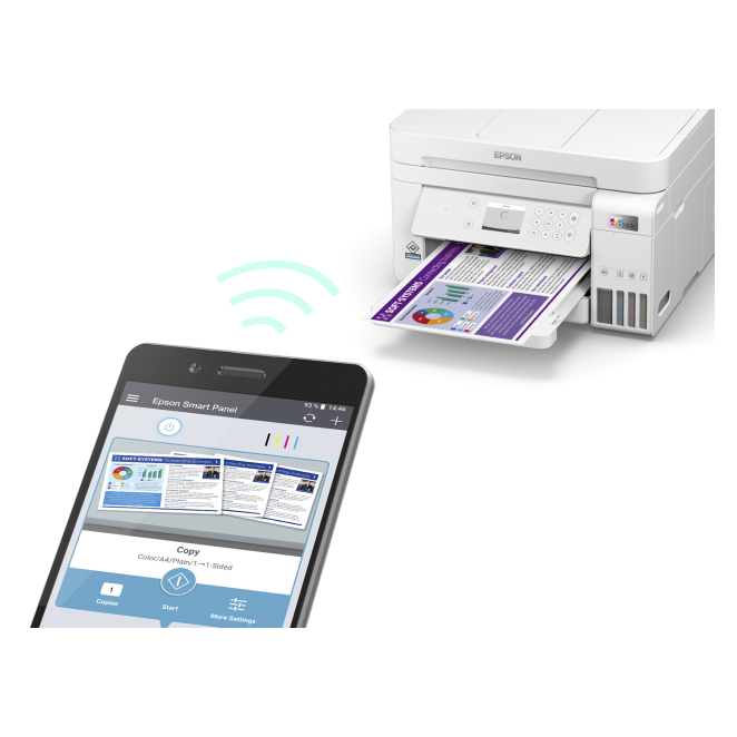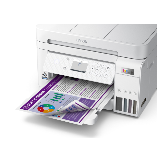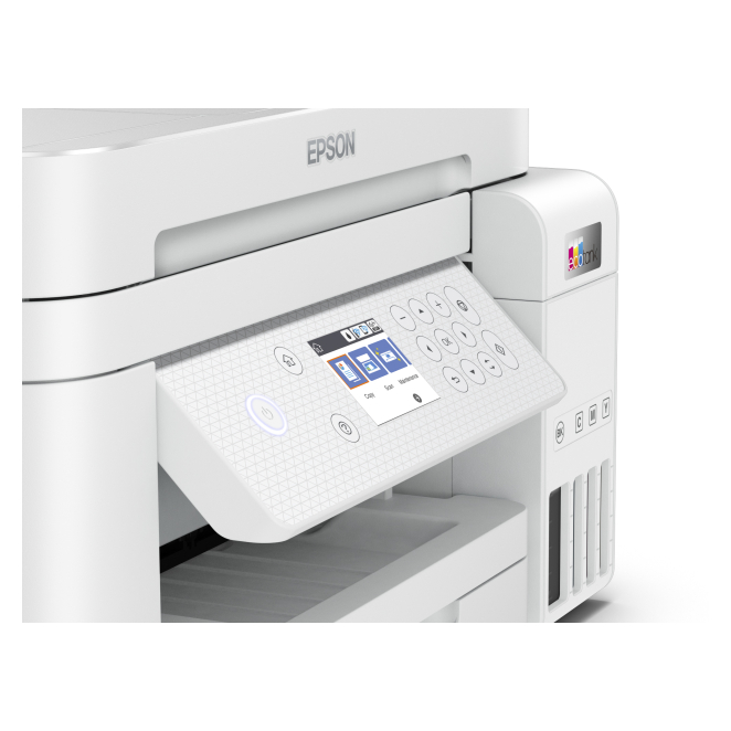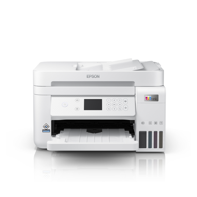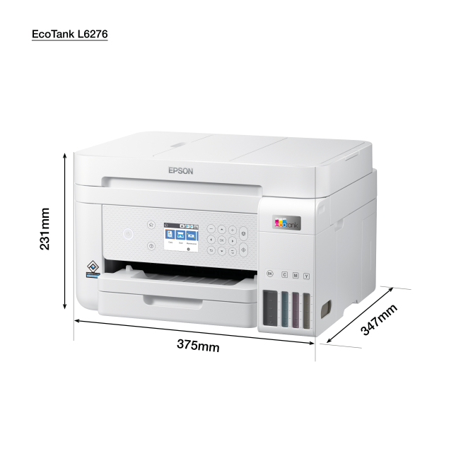Vista de la impresora Epson EcoTank L6276, una impresora multifunción de inyección de tinta con resolución de 4800 x 1200 DPI, velocidad de 33 ppm y conectividad Wifi. SKU: C11CJ61406.