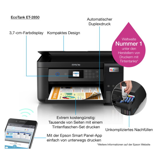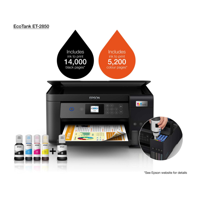 Epson EcoTank Impresora multifunción ET-2850 A4 con depósito de tinta, conexión Wi-Fi