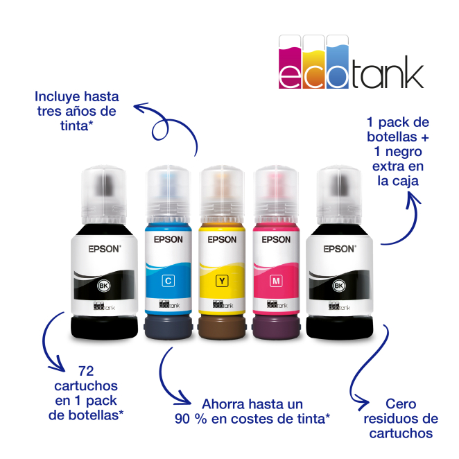 Impresora multifunción Epson EcoTank modelo ET-2850 con depósito de tinta y conexión Wi-Fi, SKU C11CJ63405 Stock disponible en nuestros almacenes Financiado desde: 16,96 € /mes Solicita información en caso de necesitar envío urgente. Métodos de pago: Epson EcoTank Impresora multifunción ET-2850 A4 con depósito de tinta, conexión Wi-Fi La Epson EcoTank Impresora multifunción ET-2850 A4 es la solución ideal para aquellos que buscan eficiencia, ahorro y comodidad en sus tareas de impresión. Este modelo de Epson posee un depósito de tinta de ultraalta capacidad, permitiendo recargas limpias y sencillas con botellas diseñadas para evitar errores. Con una resolución máxima de 5760 x 1440 y una velocidad de impresión sorprendente, es perfecta tanto para el hogar como para la oficina. Además, integra la tecnología de impresión sin calor Micro Piezo, garantizando menor consumo energético y durabilidad. Conectividad Wi-Fi y Wi-Fi Direct aportan flexibilidad y modernidad, permitiendo imprimir desde smartphones, tablets y laptops. La Epson EcoTank Impresora multifunción ET-2850 ofrece numerosos beneficios adaptados a las necesidades modernas de impresión. Ahorra hasta un 90% en costes de impresión con su tecnología EcoTank, permitiendo que imprimas sin preocuparte por sustituir cartuchos constantemente. Con una capacidad para imprimir hasta 7500 páginas en negro y 6000 en color, esta impresora resulta ser una opción sumamente económica y eficiente. Además, gracias a su conectividad Wi-Fi, puedes gestionar todas las funciones desde dispositivos móviles mediante la aplicación Epson Smart Panel. Fácil de usar y configurar, esta impresora se adapta a cualquier entorno de trabajo, mejorando significativamente la productividad. La Epson EcoTank Impresora multifunción ET-2850 es ideal para una amplia gama de usuarios. Desde estudiantes que requieren imprimir gran cantidad de materiales educativos, hasta profesionales que necesitan entregar reportes, presentaciones y documentos importantes de manera eficiente. Hogares con variados perfiles también se benefician de su bajo coste de operación y facilidad de uso. Además, es perfecta para pequeñas oficinas y despachos que buscan reducir costos de impresión sin sacrificar calidad. Su conectividad inalámbrica la hace especialmente útil para entornos donde múltiples usuarios necesitan acceder a la impresora desde sus dispositivos móviles. Diseñada para facilitar el día a día, la Epson EcoTank Impresora multifunción ET-2850 ofrece una experiencia de usuario intuitiva y eficiente. Su pantalla LCD a color y su sistema de impresión automático a doble cara simplifican el manejo cotidiano. La integración con la aplicación Epson Smart Panel permite realizar tareas de impresión, copia y escaneo desde cualquier lugar, ofreciendo total libertad y flexibilidad. Además, la opción de impresión sin bordes proporciona fotos y documentos de alta calidad, mientras que la impresora se puede configurar fácilmente gracias a su preinstalado cabezal de impresión. Decidirte por la Epson EcoTank Impresora multifunción ET-2850 será una excelente inversión por varias razones: Imprime hasta 7500 páginas en negro y 6000 en color con un solo juego de botellas de tinta, reduciendo considerablemente los costos. Con Wi-Fi y Wi-Fi Direct, puedes imprimir desde cualquier lugar usando tu smartphone o tablet. Con una resolución de hasta 5760 x 1440, garantiza impresiones nítidas y detalladas. Utiliza la tecnología sin calor Micro Piezo, lo que disminuye el consumo energético y afecta favorablemente al medioambiente. Integración de impresión, copia y escaneo en un solo dispositivo compacto y fácil de usar. En esta sección, repasaremos algunas de las preguntas más frecuentes relacionadas con la Epson EcoTank Impresora multifunción ET-2850: Sí, la Epson EcoTank Impresora multifunción ET-2850 es compatible con sistemas operativos Mac, permitiendo una fácil conexión a través de Wi-Fi. Las botellas de tinta de la Epson EcoTank Impresora multifunción ET-2850 pueden durar hasta 3 años, imprimiendo hasta 7500 páginas en negro y 6000 páginas en color. El paquete incluye una impresora Epson EcoTank multifunción ET-2850, botellas de tinta iniciales, cable de alimentación, y tarjeta de garantía. La Epson EcoTank Impresora multifunción ET-2850 puede operarse con el software Epson Smart Panel, disponible para descarga en dispositivos móviles. Sí, la Epson EcoTank Impresora multifunción ET-2850 cuenta con impresión dúplex automática, lo que facilita la impresión a doble cara. Modo de impresión a doble cara Auto Formatos de imagen soportados BMP, JPEG, PICT, PNG, TIFF Tecnología de impresión Inyección de tinta Impresión Impresión a color Impresión dúplex Sí Resolución máxima 5760 x 1440 DPI Velocidad de impresión (negro, calidad normal, A4/US Carta) 33 ppm Tiempo hasta primera página (negro, normal) 10 s Tiempo hasta primera página (color, normal) 16 s Copia a doble cara Sí Copiando Copia a color Resolución óptica de escáner 1200 x 2400 DPI Escaneando Escaneo a color Tecnología de escaneado CIS Enviando por fax No Posicionamiento de mercado Hogar y oficina Funciones dúplex Copiar, Escanear, Imprimir Número de cartuchos de impresión 4 Colores de impresión Negro Formatos de imagen soportados BMP, JPEG, PICT, PNG, TIFF País de origen Filipinas Tipo de escaneado Escáner de cama plana Color del producto Negro Pantalla LCD Pantalla incorporada Sí Pantalla a color Sí Diagonal de la pantalla 1.5 " Ciclo de trabajo (máximo) 30000 páginas por mes Escanear a Nube Número total de bandejas de entrada 1 Capacidad de entrada total 100 hojas Capacidad de salida total 30 hojas Capacidad de entrada de bandeja multiuso 100 hojas Bandeja multifunción Sí Tipos de papel Papel fotográfico, Papel normal ISO tamaño de serie A (A0...A9) A4, A5, A6 ISO tamaño de serie B (B0...B9) B5, B6 ISO tamaño de serie C (C0...C9