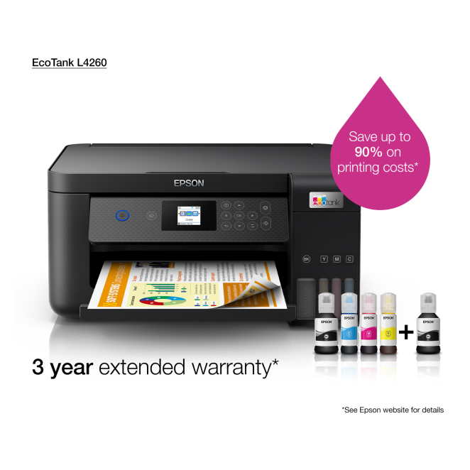 La impresora Epson EcoTank L4260 ofrece numerosas ventajas. Sus cartuchos de tinta de alta capacidad reducen significativamente los costes de impresión. Con la funcionalidad dúplex automática, ahorra tiempo y papel al imprimir por ambos lados. La impresora Epson EcoTank L4260 cuenta con conectividad inalámbrica que permite impresiones remotas y flexibilidad en la colocación de la impresora sin preocuparse por cables.