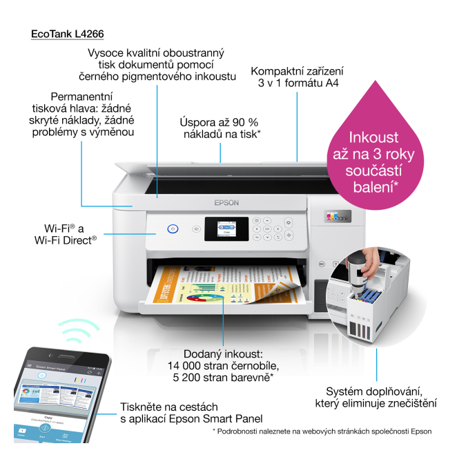 La Epson EcoTank L4266 ofrece múltiples beneficios, desde su diseño económico hasta su alta capacidad de impresión. Gracias a su impresión de alta resolución, podrás obtener documentos y fotos nítidos y claros. La capacidad de imprimir a color con una velocidad de hasta 15 ppm hace que esta impresora sea ideal para cualquier entorno de trabajo. Además, la conectividad WiFi permite realizar impresiones remotas fácilmente. Con su tecnología de impresión sin cartuchos, no tendrás que preocuparte por el reemplazo constante de los mismos, añadiendo un plus en la gestión de costes.