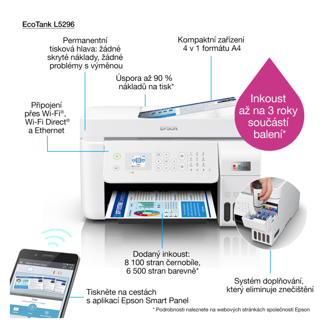 Los cartuchos de alta capacidad de la Epson EcoTank L5296 permiten imprimir más páginas antes de necesitar reemplazos, lo cual reduce los costes operativos y el tiempo dedicado al mantenimiento.
