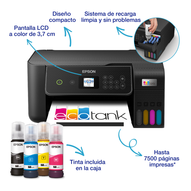 La impresora Epson EcoTank ET-2870 ofrece una serie de beneficios que la hacen una opción preferida para muchos usuarios. Sus depósitos de tinta de ultra alta capacidad reducen significativamente los costes de impresión, permitiendo ahorrar hasta un 90%. La impresión sin cartuchos hace que el proceso de recarga sea limpio y sencillo. Además, la Epson EcoTank ET-2870 incluye una pantalla LCD a color de 3,7 cm, lo que facilita la gestión de tareas de impresión, copia y escaneo. El uso de la aplicación Epson Smart Panel permite un control remoto total de la impresora desde dispositivos móviles, aumentando así la flexibilidad y conveniencia.
