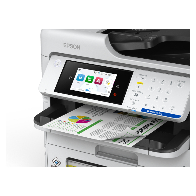 Sí, la Epson WorkForce Pro EM-C800RDWF es compatible con sistemas operativos Mac, lo que facilita su integración en entornos variados. La configuración del WiFi se puede realizar a través de la pantalla táctil de la impresora siguiendo el asistente de configuración de red. Acepta una variedad de tipos de papel, incluyendo tamaños del ISO A-series hasta A4 y pesos entre 64-300 g/m². Sí, con la funcionalidad de Wi-Fi Direct y la aplicación Epson iPrint, es posible imprimir directamente desde smartphones y tablets. Sí, incluye fax a color con una velocidad de transmisión de hasta 33.6 kbps y una memoria de hasta 550 páginas. La impresora es eficiente en términos energéticos, con un consumo de sólo 30 W al copiar y una calificación TEC de 0.18, cumpliendo con los estándares Energy Star. Formatos de imagen soportados JPEG, TIFF Tecnología de impresión Inyección de tinta Impresión Impresión a color Impresión dúplex Sí Resolución máxima 4800 x 1200 DPI Velocidad de impresión (negro, calidad normal, A4/US Carta) 35 ppm Tiempo hasta primera página (negro, normal) 4.8 s Tiempo hasta primera página (color, normal) 5.3 s Copia a doble cara Sí Copiando Copia a color Resolución máxima de copia 600 x 1200 DPI Resolución óptica de escáner 1200 x 2400 DPI Escaneado dúplex Sí Escaneando Escaneo a color Tecnología de escaneado CIS Enviando por fax Fax a color Posicionamiento de mercado Grupo de trabajo (Workgroup) Funciones dúplex Copiar, Escanear, Imprimir Número de cartuchos de impresión 4 Colores de impresión Amarillo, Cian, Magenta, Negro Formatos de imagen soportados JPEG, TIFF Tipo de escaneado Escáner plano y alimentador automático de documentos (ADF, Automatic Document Feeder) Color del producto Blanco Pantalla incorporada Sí Tipo de control Tocar Pantalla a color Sí Ciclo de trabajo (máximo) 70000 páginas por mes Escanear a Correo electrónico, FTP, Network folder, PC, Tarjeta de memoria, USB Memoria interna 3072 MB Número total de bandejas de entrada 2 Capacidad de entrada total 330 hojas Capacidad de salida total 150 hojas Capacidad de entrada máxima 1830 hojas Tipos de papel Executive, Membrete, Papel normal, Papel reciclado ISO tamaño de serie A (A0...A9) A4, A5, A6 ISO tamaño de serie B (B0...B9) B5, B6 Tamaño de impresora No-ISO Carta, Legal Tamaño de sobres 10, C4, C6, DL Tamaño de papel fotográfico 10x15 cm, 13x18 cm, 9x13 cm Peso del papel 64-300 g/m² Impresión directa Sí Puerto USB Sí Tecnología de impresión móvil Apple AirPrint, Epson Connect, Google Cloud Print Wifi Sí Ethernet Sí Tecnología de cableado 10/100/1000Base-T(X) Ethernet LAN, velocidad de transferencia de datos 10 Mbit/s, 100 Mbit/s, 1000 Mbit/s Wi-Fi estándares 802.11a, 802.11b, 802.11g, Wi-Fi 4 (802.11n), Wi-Fi 5 (802.11ac) Wi-Fi Direct Sí Algoritmos de seguridad soportados 128-bit WEP, 64-bit WEP, WPA2-AES, WPA2-Enterprise, WPA2-PSK, WPA3-SAE Consumo energético (en suspensión) 1.1 W Consumo de energía (apagado) 0.2 W Enery Star Consumo Electrico Típico (TEC) 0.18 kWh/semana Frecuencia de entrada AC 50/60 Hz Voltaje de entrada AC 100 - 240 V Ancho 425 mm Profundidad 535 mm Altura 413 mm Peso 21300 g