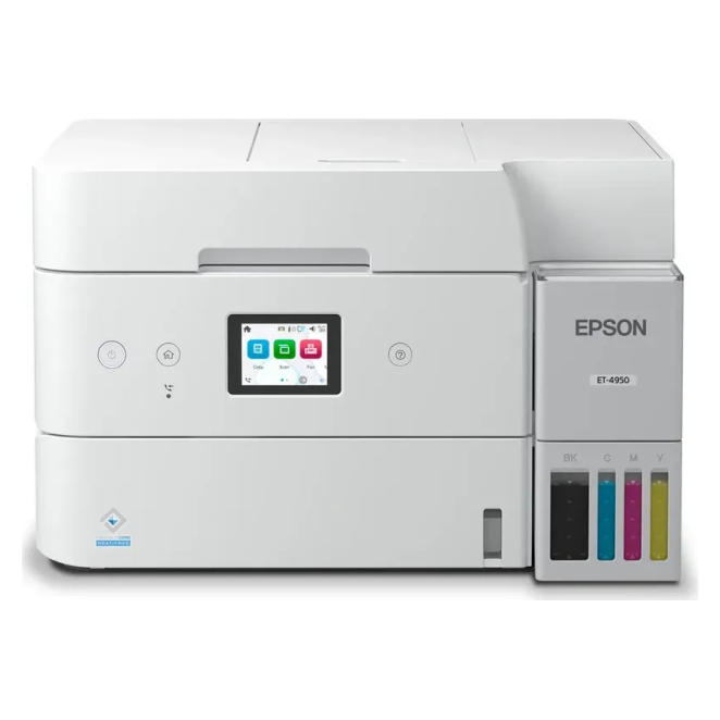 Vista frontal de la impresora Epson EcoTank ET-4956 con impresión de inyección de tinta, resolución de 4800 x 1200 DPI, velocidad de 35 ppm y conectividad Wifi. SKU: C11CL40403