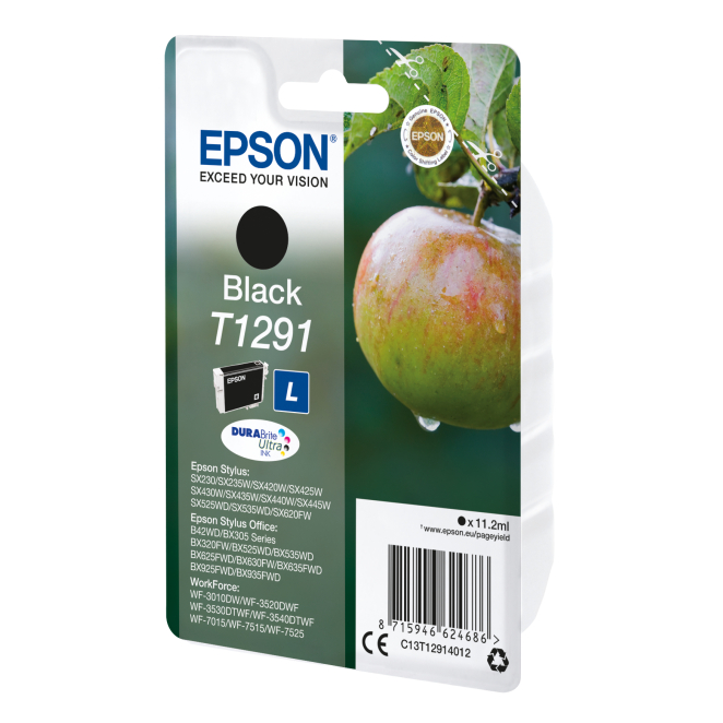 Cartucho de tinta negro Epson Apple modelo T1291, compatible con impresoras Epson. SKU: C13T12914012 Stock disponible en nuestros almacenes Financiado desde: 0,90 € /mes Solicita información en caso de necesitar envío urgente. Métodos de pago: Epson Apple Cartucho T1291 negro