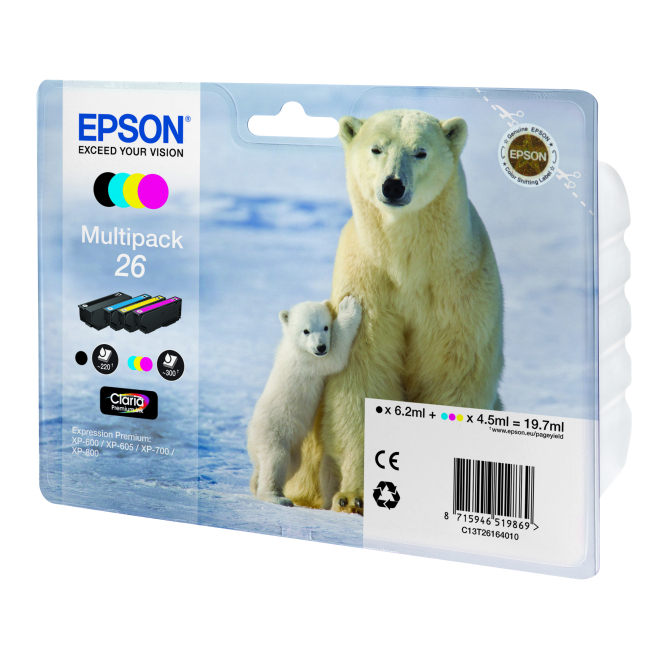 Epson Multipack 26 Polar Bear que incluye cartuchos de tinta en 4 colores, SKU C13T26164010, apto para impresoras Epson.