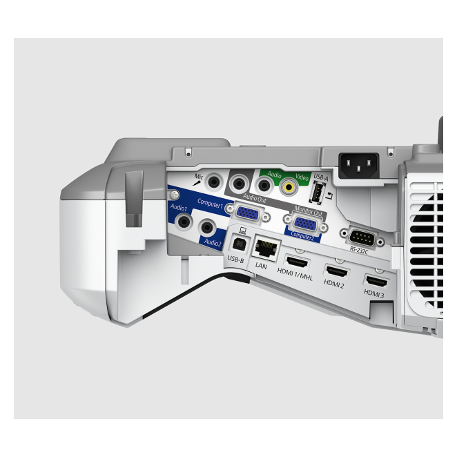 El proyector cuenta con múltiples puertos de conectividad, incluyendo HDMI, USB, VGA, y Ethernet, permitiendo una conexión fácil con diversos dispositivos.