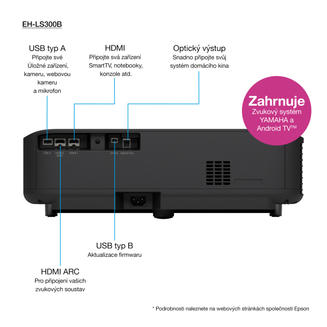 Estas son algunas de las preguntas que suelen tener los usuarios sobre el proyector Epson EH-LS300B: Puedes ver películas, series, jugar videojuegos y realizar presentaciones con alta calidad de imagen. Sí, el proyector Epson EH-LS300B cuenta con un sistema de sonido YAMAHA integrado. Muy fácil. Gracias a su diseño intuitivo y compatibilidad con Android TV, la configuración es rápida y sencilla. La fuente de luz láser del Epson EH-LS300B tiene una duración estimada de hasta 20,000 horas. Sí, puedes conectar dispositivos Bluetooth al proyector para usarlo como altavoz independiente. Compatibilidad de tamaño de pantalla 61-120 " Distancia de proyección (wide) 0.4-0.4 m Brillo de proyector 3600 lúmenes ANSI Tecnología de proyección 3LCD Resolución original del proyector 1080p (1920x1080) Razón de contraste (típica) 2500000:1 Relación de aspecto nativa 16:9 Tamaño de matriz 0.61 " Tipo de fuente luminosa Laser Duración de la fuente luminosa 20000 h Relación de alcance 0.26 - 0.35:1 Full HD Sí 3D Sí Modos de color de vídeo Cine, Dinámico, Natural, Proyector, Vivo Cantidad de puertos USB 2.0 1 Cantidad de puertos Mini-USB 2.0 1 Número de puertos HDMI 2 Puerto DVI No Wifi Sí Wi-Fi estándares 802.11a, 802.11b, 802.11g, Wi-Fi 4 (802.11n), Wi-Fi 5 (802.11ac) Nivel de ruido 37 dB Nivel de ruido (modo económico) 23 dB HDCP Sí Altavoces incorporados Sí Potencia estimada RMS 20 W Posicionamiento de mercado Cine en casa Tipo de producto Proyector de alcance estándar Color del producto Negro Ubicación Piso, TV cabinet Fuente de energía Corriente alterna Consumo de energía (inactivo) 2 W Consumo (modo de ahorro) 179 W Voltaje de entrada AC 100-240 V Frecuencia de entrada AC 50 - 60 Hz Sistema operativo instalado Android TV Intervalo de temperatura operativa 5-35 °C Intervalo de humedad relativa para funcionamiento 20-80 % Ancho 467 mm Profundidad 400 mm Altura 149 mm Peso 7200 g Ancho del paquete 530 mm Profundidad del paquete 565 mm Altura del paquete 234 mm Peso del paquete 9683 g Mando a distancia incluido Sí Manual de usuario Sí Pilas incluidas Sí Cables incluidos Corriente alterna