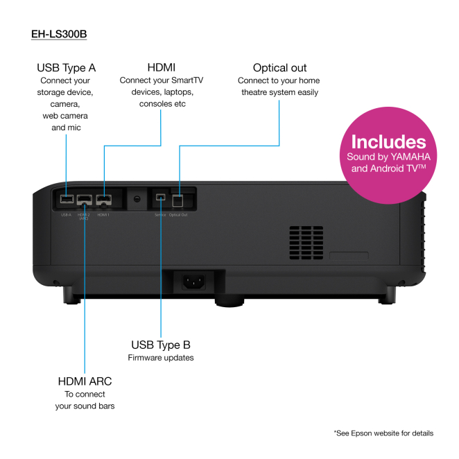 El proyector Epson EH-LS300B está diseñado pensando en la comodidad y usabilidad. Su configuración es sencilla gracias a su compatibilidad con Android TV, permitiéndote acceder fácilmente a tus aplicaciones favoritas. Con su relación de alcance corta, puedes proyectar una imagen grande desde una distancia reducida, optimizando el espacio en tu sala. El mando a distancia incluido facilita todas las operaciones, y el sistema de sonido YAMAHA mejora notablemente la experiencia de visualización.