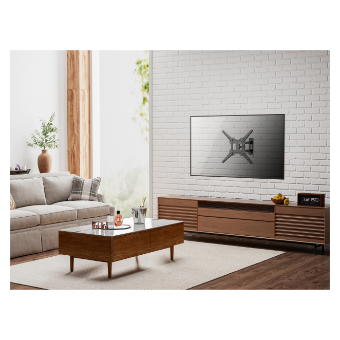 El Equip soporte de pared para TV de movimiento completo de 23-55 pulgadas ofrece numerosos beneficios que garantizan la mejor experiencia de visualización. Este soporte cuenta con ajuste de inclinación y ángulo de giro de -90° a 90°, permitiendo una máxima flexibilidad para encontrar el ángulo perfecto. Su gestión de cables ayuda a mantener su área de entretenimiento libre de desorden, mientras que su capacidad para soportar hasta 30 kg asegura la estabilidad de su televisor. Con el Equip soporte de pared para TV de movimiento completo de 23-55 pulgadas, podrá disfrutar de una colocación óptima y segura de su televisión, mejorando simultáneamente la estética de su espacio.