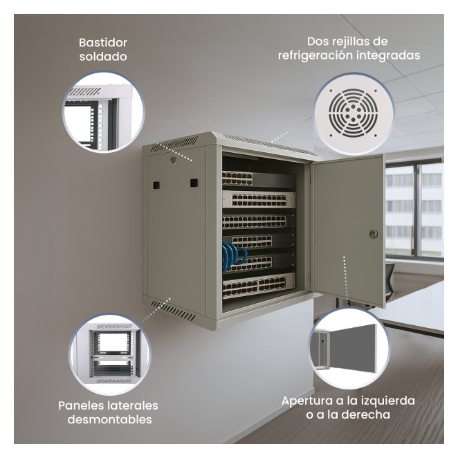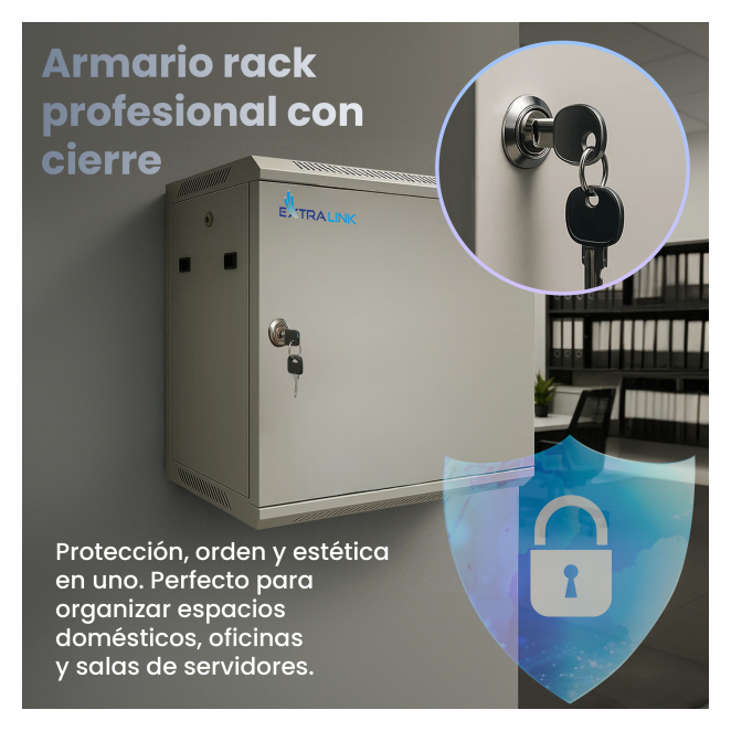 Cuenta con cerraduras en puertas y paneles laterales, protegiendo los equipos.