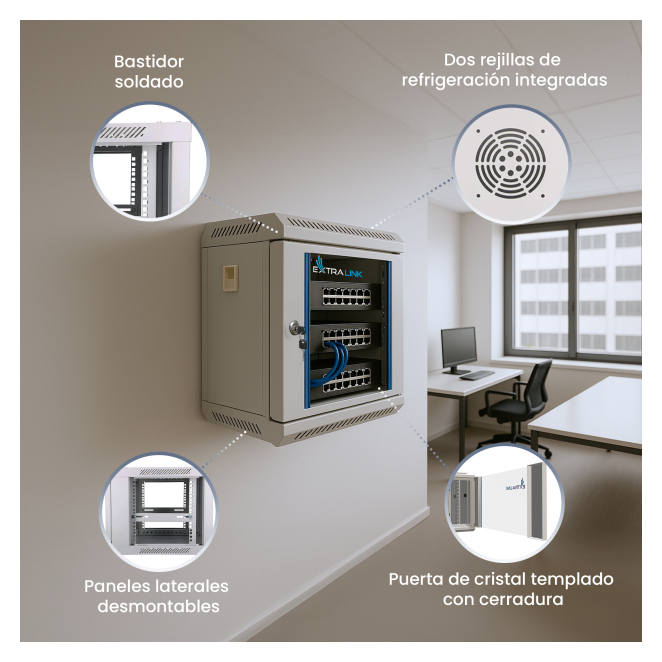 El Extralink Armario rackmount 4U 10″ Gris ofrece varios beneficios clave. En primer lugar, su estructura de acero laminado en frío garantiza durabilidad y resistencia a daños. La puerta frontal de vidrio templado no solo permite una buena visualización del interior, sino que también aporta un nivel adicional de seguridad. Los paneles laterales desmontables facilitan el acceso a los equipos y hacen más sencillas las modificaciones internas. Además, el Extralink Armario rackmount 4U incluye pasacables que permiten una gestión de cables eficiente, contribuyendo a mantener el orden y la estética del cableado. Este rack es ideal para la instalación de servidores y otros equipos de red.