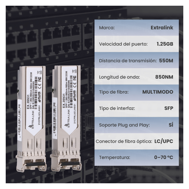 El Extralink SFP 1.25G 2-pack admite velocidades de transmisión de 1,25 Gbps y 1,0625 Gbps.