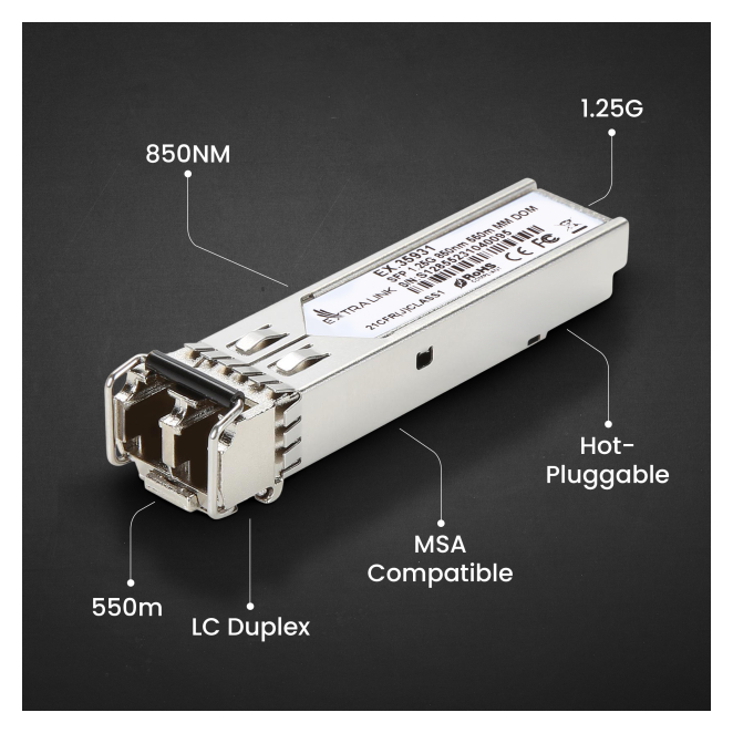 Módulo transceptor Extralink SFP 1.25Gbps, LC/UPC, 850nm, alcance 550m, compatible con HP/Aruba, SKU EX.35931