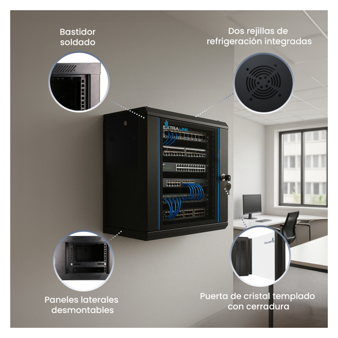 El Extralink Armario rackmount 9U 600×600 Negro montaje en la pared está diseñado para proporcionar una experiencia de usuario óptima en términos de usabilidad y comodidad. Sus puertas de vidrio templado permiten un acceso sencillo al interior, mientras que los paneles laterales desmontables facilitan las tareas de mantenimiento. Las cerraduras y llaves proporcionan un alto nivel de seguridad, y los orificios en el techo y el panel inferior permiten una gestión de cables ordenada. Además, la posibilidad de instalar ventiladores asegura un mantenimiento adecuado de la temperatura, incrementando así la vida útil de los equipos.