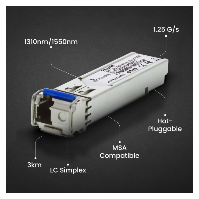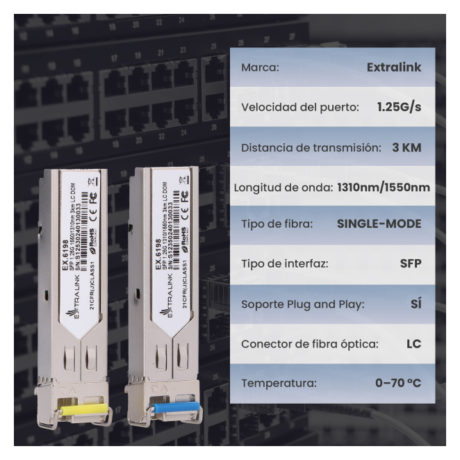 El módulo SFP Extralink soporta una distancia de transmisión de hasta 3km utilizando fibra monomodo.