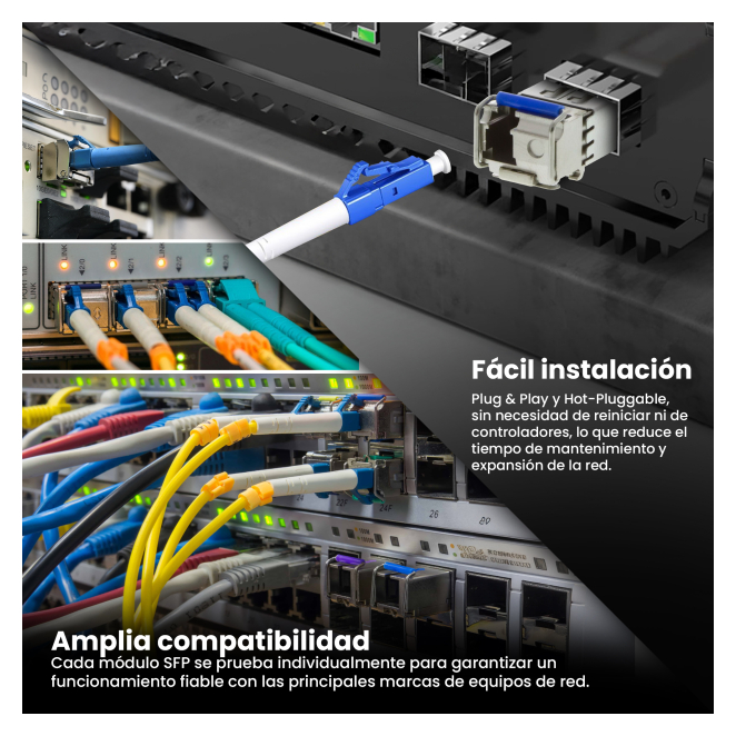 Es compatible con las normativas RoHS, FCC y cumple con los estándares SFP MSA y SFF-8472.