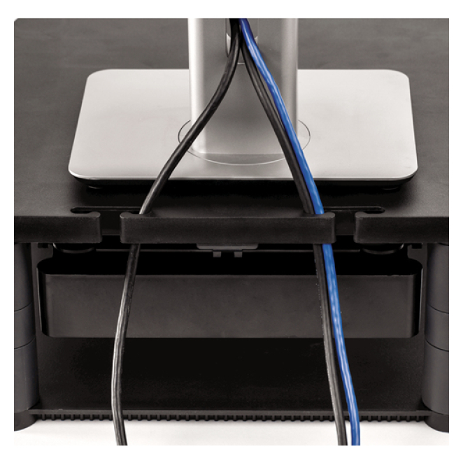 Incluye solución para manejo de cables, manteniéndolos ordenados y accesibles, lo cual facilita la organización de tu área de trabajo.