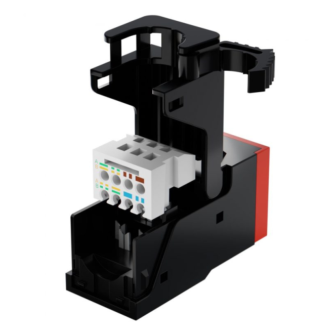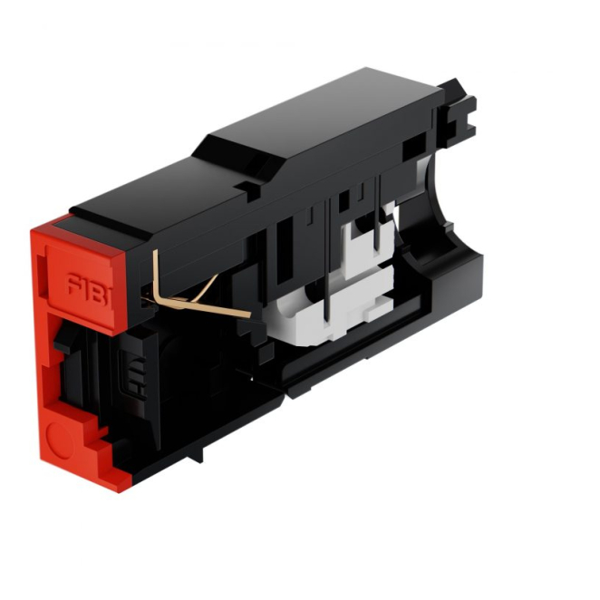 Conector Fibrain XQ100 en colores negro y rojo, diseñado para alta conectividad en cableado. SKU: XQ100