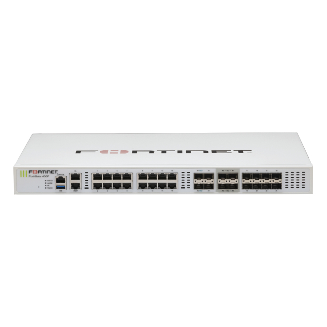 FortiGate-400F 18 x GE RJ45 ports (including 1 x MGMT port, 1 X HA port, 16 x switch ports), 8 x GE SFP slots, 8 x 10GE SFP+ slots, SPU NP7 and CP9 hardware accelerated, dual AC power supplies