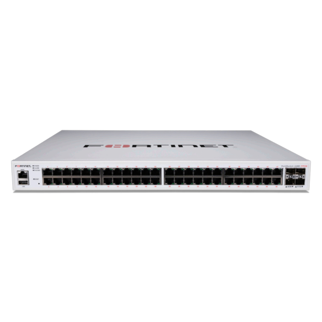 Imagen del Fortinet FortiSwitch-448E-FPOE, un switch Layer 2/3 compatible con controlador FortiGate, que cuenta con 48 puertos GE RJ45, 4 puertos 10 GE SFP+ y salida PoE+ máxima de 772W, SKU FS-448E-FPOE
