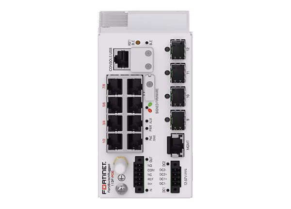 FortiSwitchRugged-112F-POE Layer 2 ruggedized FortiGate switch controller compatible PoE switch with 8 x 1GE/100M/10M RJ45 PoE 802.3bt type 4 (90W) with maximum 240W limit, and 4 x 1G/100M SFP. IP40 rating.
