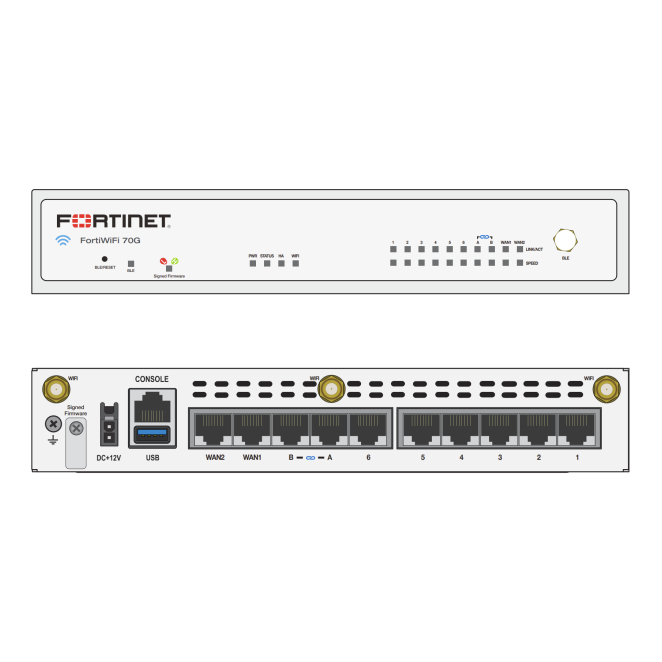 Imagen del firewall Fortinet FortiWiFi 70G PoE con suscripción a FortiCare Premium y FortiGuard Enterprise Protection por 12 meses. SKU FWF-70G-POE-E-BDL-809-12