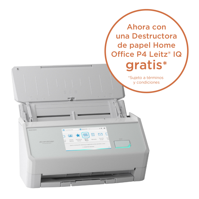El Ricoh ScanSnap IX2500 es una inversión inteligente para cualquier entorno profesional que busque mejorar su eficiencia. Alta velocidad de escaneo: Procesa hasta 45 páginas por minuto, optimizando el tiempo de digitalización. Capacidad del ADF: Alimentador automático de documentos de 100 hojas para grandes volúmenes. Conectividad versátil: Compatible con WiFi y USB 3.2 Gen 1 para mayor flexibilidad. Software incluido: Herramientas como ScanSnap Home y Kofax Power PDF Standard para una gestión eficiente de los documentos. Pantalla táctil intuitiva: Facilita la configuración y el uso diario del escáner. Aquí te proporcionamos respuestas a algunas preguntas frecuentes sobre el Ricoh ScanSnap IX2500: El Ricoh ScanSnap IX2500 ofrece una resolución óptica de escáner de 600 x 600 DPI, ideal para obtener imágenes claras y detalladas. El Ricoh ScanSnap IX2500 puede escanear una amplia variedad de documentos, incluyendo tarjetas de visita, papel fotográfico, papel normal, postales y más. Sí, el escáner Ricoh ScanSnap IX2500 incluye conectividad WiFi, permitió integrar fácilmente el escáner en una red inalámbrica. El Ricoh ScanSnap IX2500 viene con varios software incluídos, tales como ScanSnap Home, ScanSnap Home Mobile, ABBYY FineReader for ScanSnap, y Kofax Power PDF Standard. El Ricoh ScanSnap IX2500 puede manejar tamaños de papel ISO A-series hasta A3, adaptándose a múltiples formatos y necesidades. Tamaño máximo de escaneado 297 x 432 mm Resolución óptica de escáner 600 x 600 DPI Escaner a color Sí Escaneado dúplex Sí Velocidad de escaneo ADF (b/n, A4) 45 ppm Tipo de escaneado Escáner con alimentador automático de documentos (ADF) Color del producto Blanco Pantalla incorporada Sí Pantalla táctil Sí Tipo de control Tocar Pantalla a color Sí Diagonal de la pantalla 5 " Tipo de sensor Dual CIS Fuentes de luz LED RGB Formatos de archivo para escaneo JPEG, PDF Escanear a Correo electrónico, Nube Sensor ultrasónico Sí Capacidad del alimentador automático de documentos 100 hojas Tipos de media soportados de escaneo Papel fotográfico, Papel normal, Post Card(JPN), Tarjeta de visita ISO tamaño de serie A (A0...A9) A3, A4, A5, A6 ISO tamaño de serie B (B0...B9) B4, B5, B6 Carta Sí Legal Sí Peso del papel 40-209 g/m² Puerto USB Sí Conector USB USB Tipo C Versión USB 3.2 Gen 1 (3.1 Gen 1) Wifi Sí Wi-Fi estándares 802.11a, 802.11b, 802.11g, Wi-Fi 4 (802.11n), Wi-Fi 5 (802.11ac), Wi-Fi 6 (802.11ax) Algoritmos de seguridad soportados WPA, WPA-AES, WPA-PSK, WPA-TKIP, WPA2, WPA2-AES, WPA2-EAP, WPA2-PSK, WPA3-Personal Tipo de fuente de alimentación Corriente alterna Consumo energético 17 W Consumo energético (en suspensión) 1.4 W Consumo de energía (inactivo) 0.2 W Frecuencia de entrada AC 50/60 Hz Certificados de sostenibilidad ENERGY STAR Certificados de conformidad RoHS Intervalo de temperatura operativa 5-35 °C Intervalo de humedad relativa para funcionamiento 20-80 % Ancho 292 mm Profundidad 161 mm Altura 159 mm Peso 3500 g Software incluido ScanSnap Home, ScanSnap Home Mobile, ABBYY FineReader for ScanSnap, Kofax Power PDF Standard, Kofax Power PDF Standard for Mac